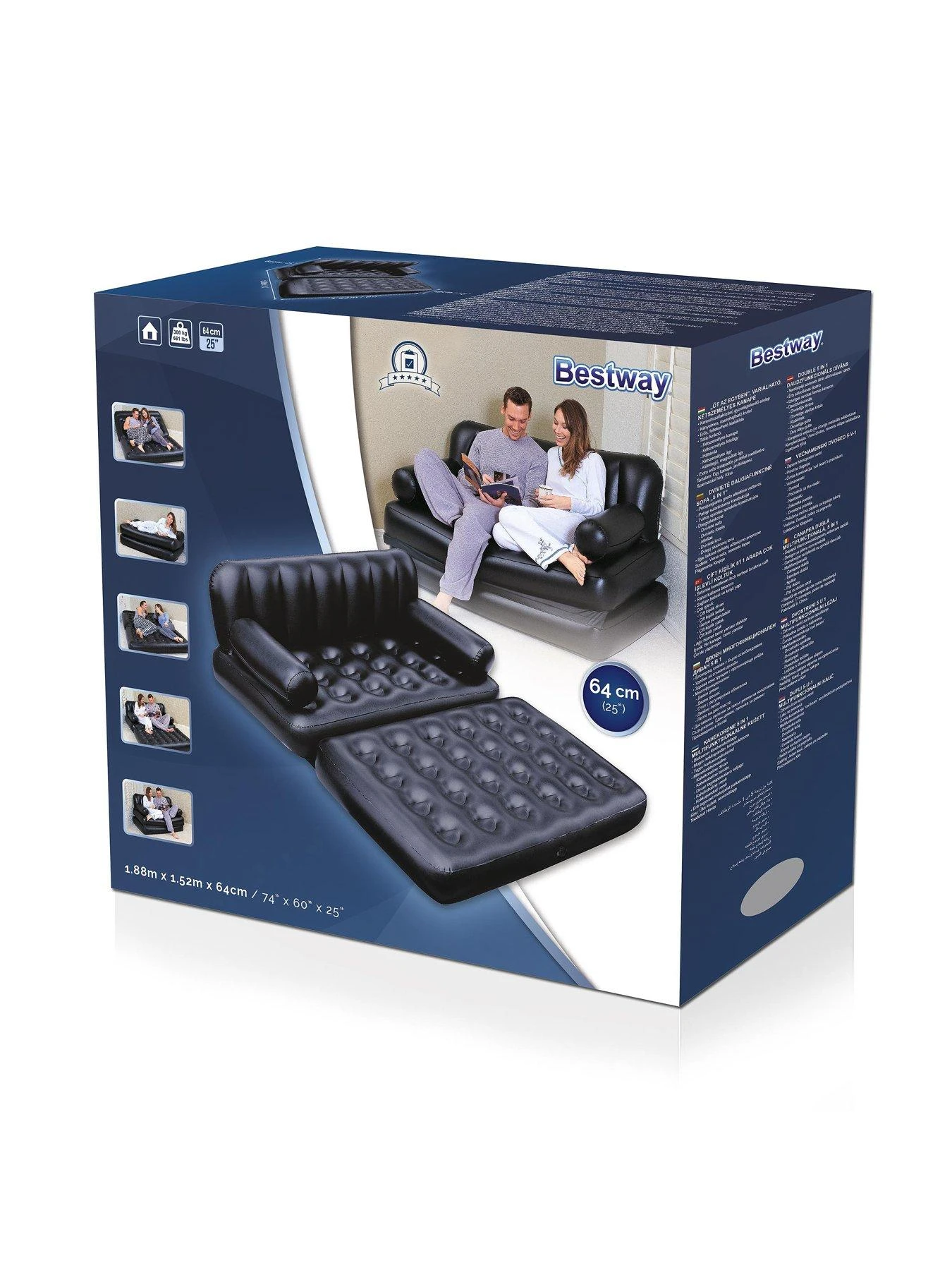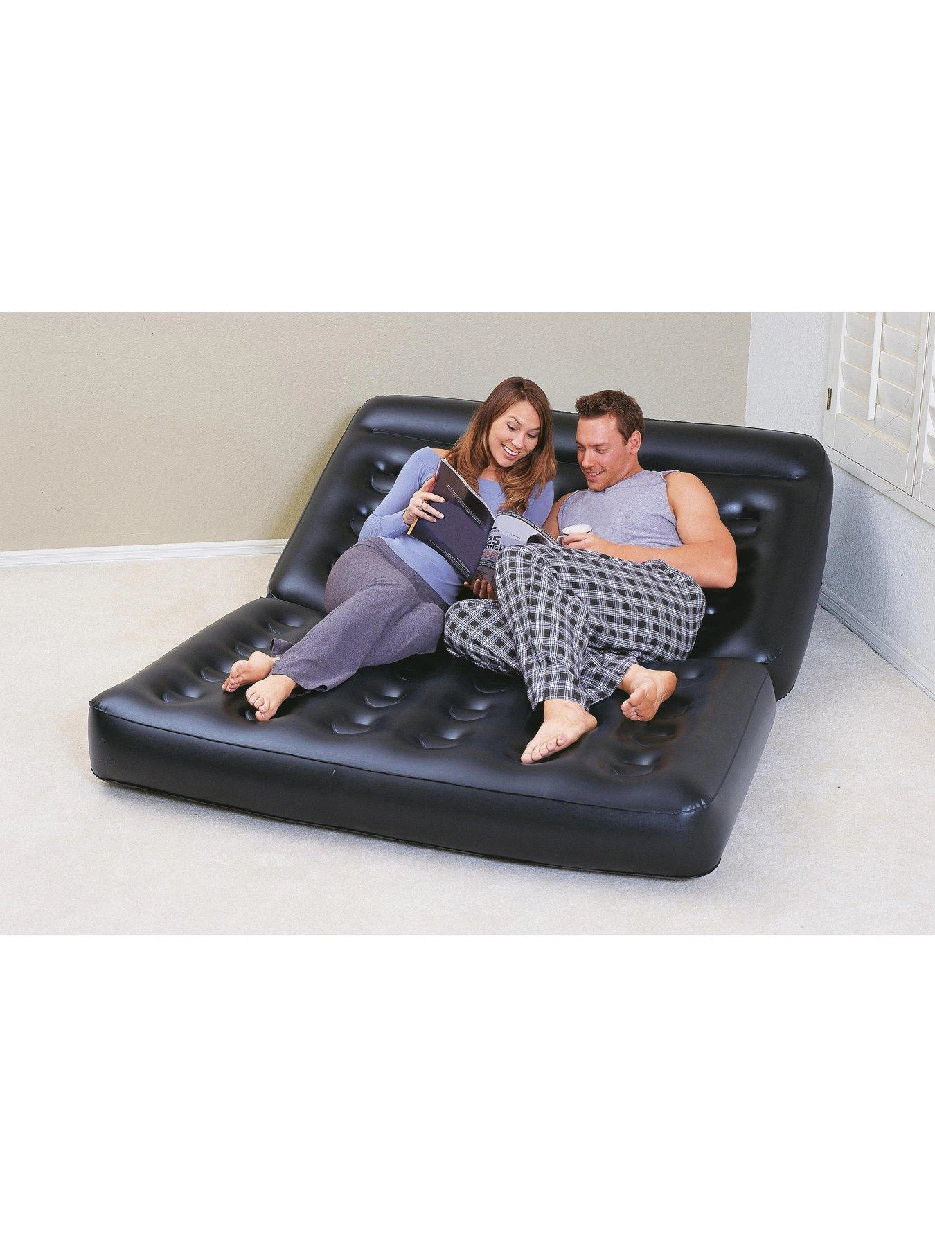 Featuring a comfortable soft flocked top and versatile seating options, the Double 5-in-1 Multifunctional Couch by Bestway???? is a perfect addition to any room. It converts easily into a double bed, a double layered bed, a recliner, a lounge or a raised bed and is ideal for quickly adding additional seating, taking mere minutes to inflate. Get ready to lounge it up and unwind in the Bestway???? Double 5-in-1 Multifunctional Couch