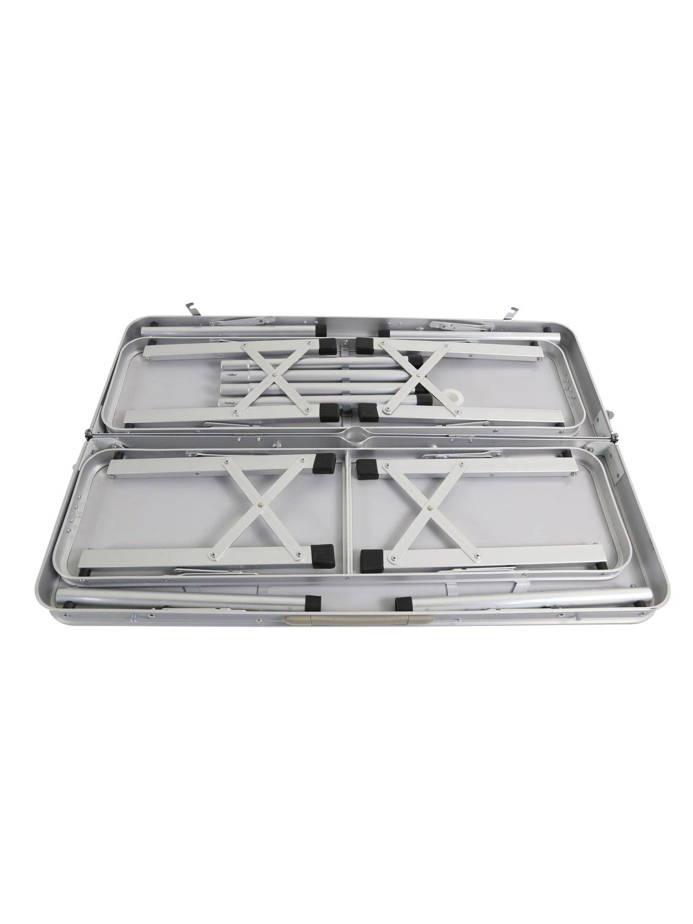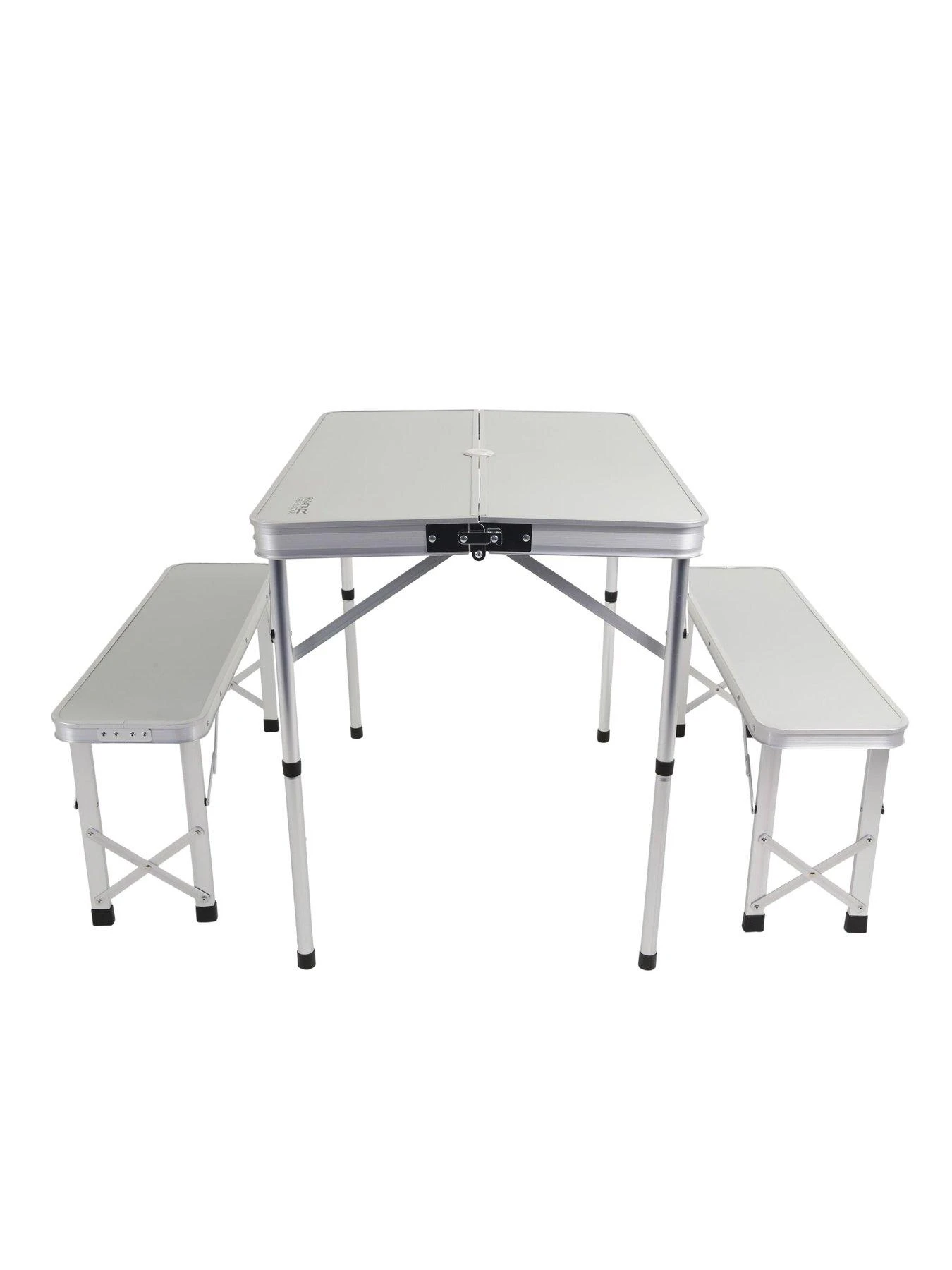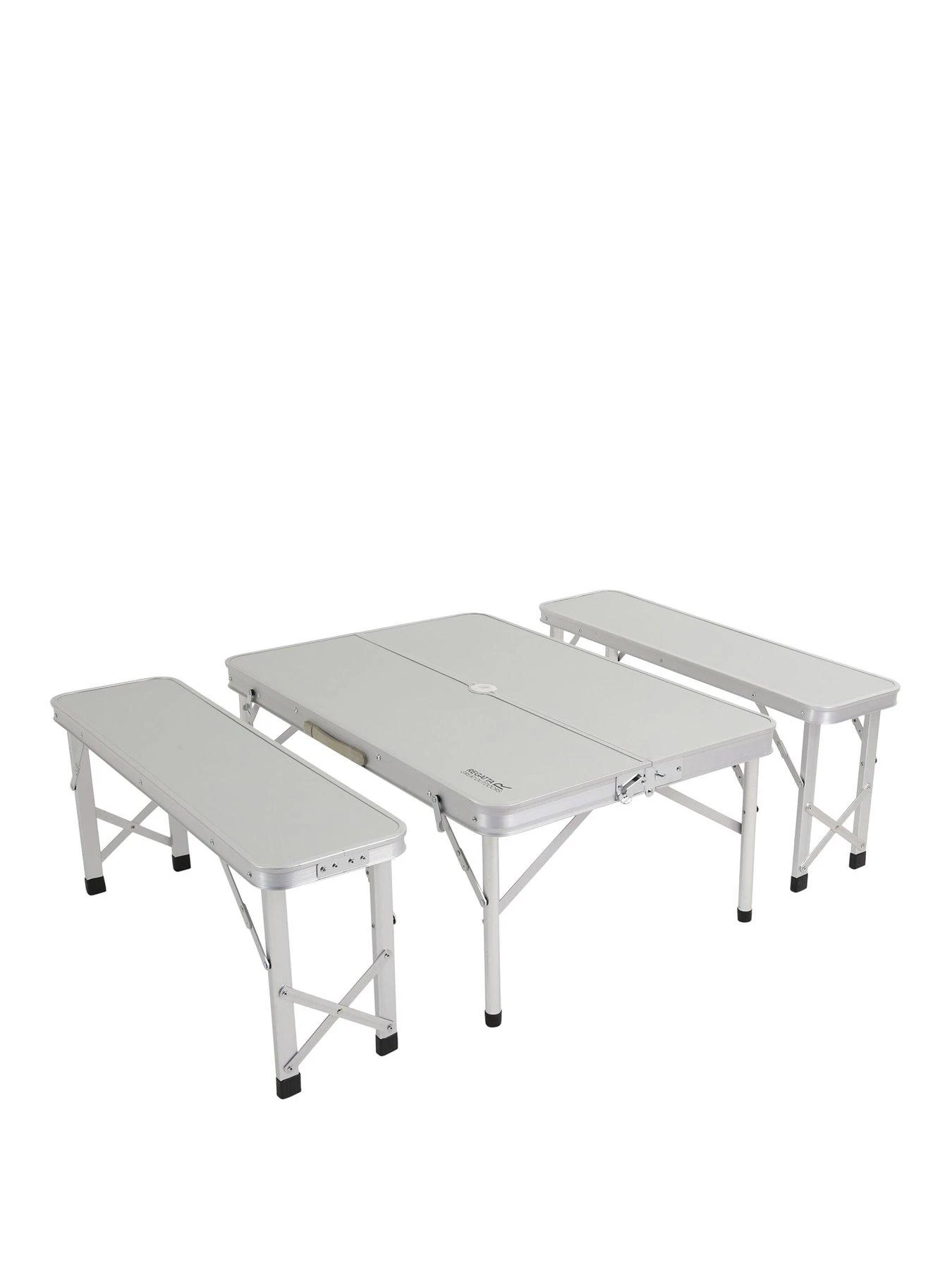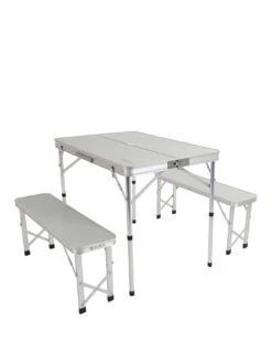 Compact Picnic Table and 2 bench set for campsites and barbecues. Steel legs and folding table for flat storage.