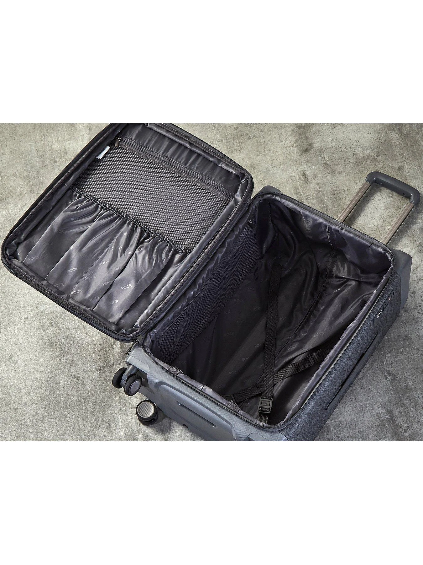 Best of both worlds! This Rock suitcase is made from ultra-strong polypropylene frame combined with a fabric body. Parker’s carry-on size has an easy access laptop section and is packed full of useful features such a removeable waterproof pouch. Built to last – all Rock products come with a 15 year manufacturer’s warranty against manufacturing defects arising from faulty workmanship or materials. Expandable – leave your packing worries behind with Parker’s expander zip on medium and large sizes, which can be opened to increase the volume of the case. Tough & Practical – 8 smooth rolling wheels and a telescopic, push-button handle will help you glide effortlessly on your travels. For your complete peace of mind, Parker cases are fitted with an integrated TSA combination lock. The design includes a zipped front pocket which can be used for conveniently storing smaller items or any last-minute extras you may need to squeeze in. The fully lined interior also features a convenient zipped mesh pocket and elasticated packing straps to keep your clothes securely in place.