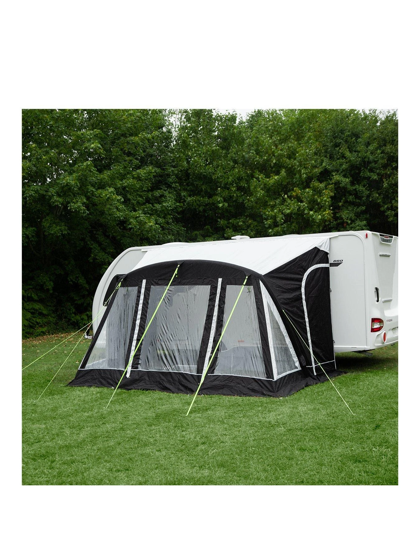 This air awning comes with inflatable air poles and beams that provide a strong and sturdy support at the front door, and the provided rear pad steel poles helps to keep the awning in place at the rear and also seals the gap between the awning and the caravan.