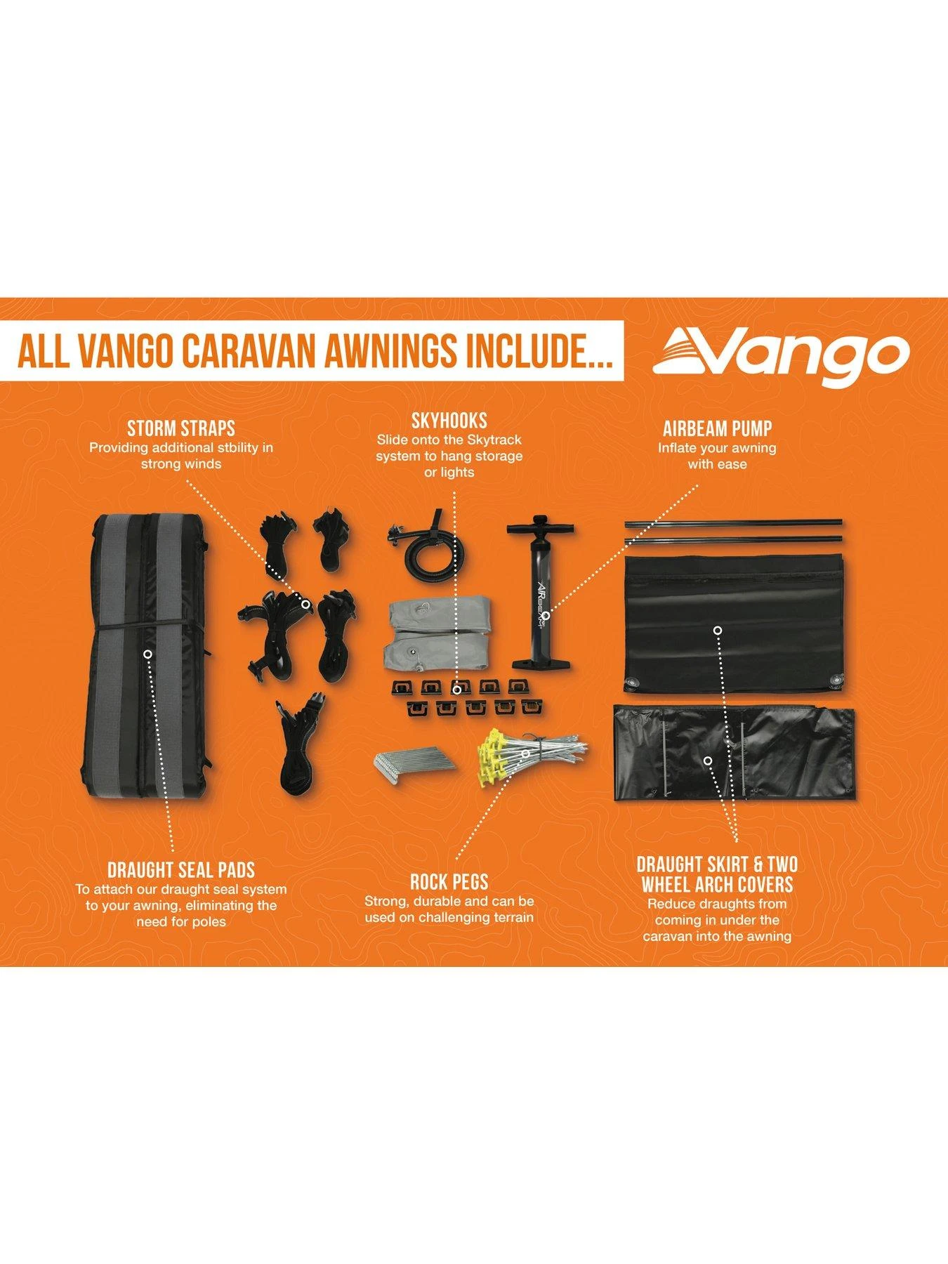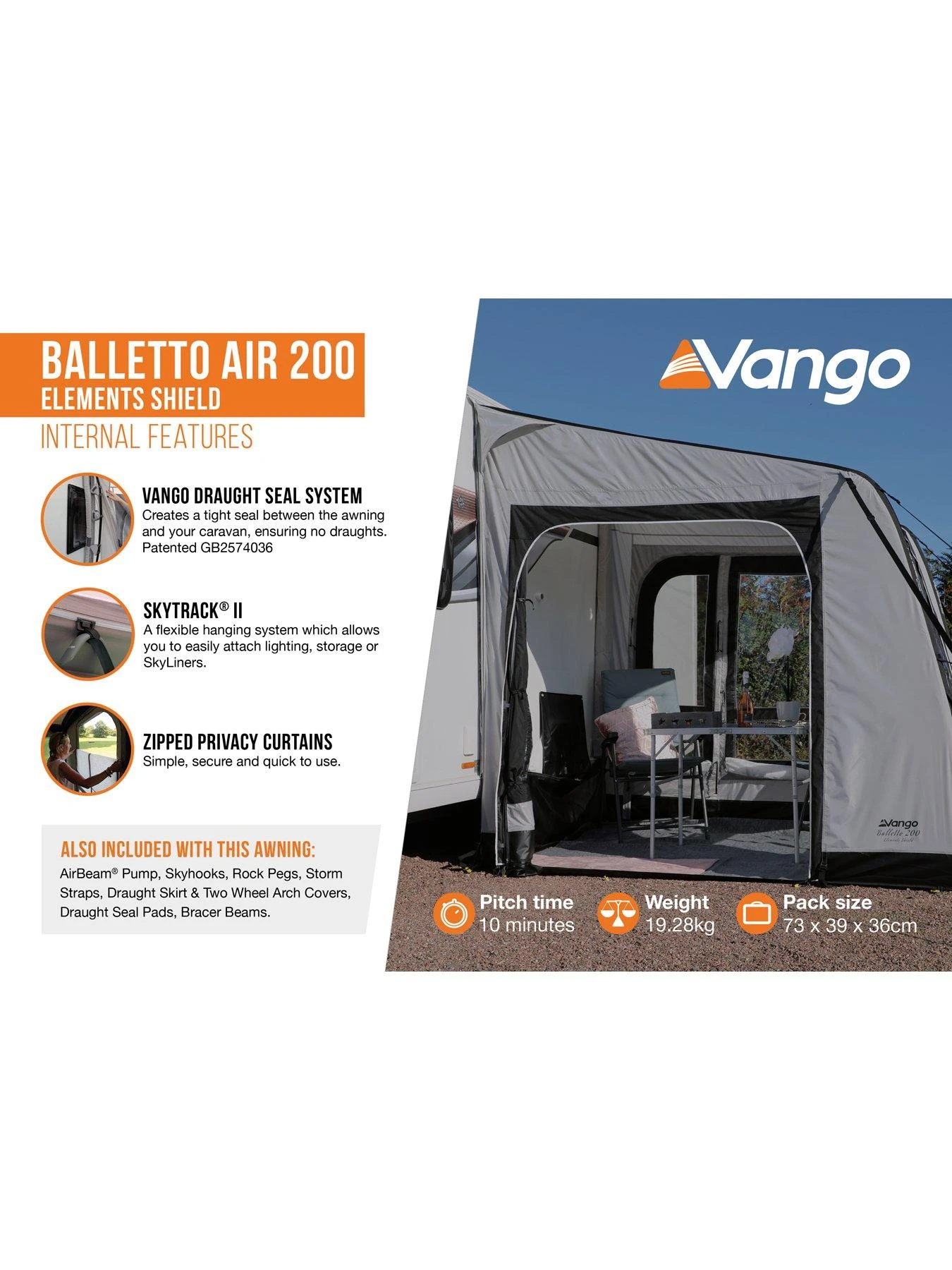 Patented Draught Seal System, including a draught skirt and 2 wheel arch covers, creates a tight seal between the awning and your caravan, ensuring no draughts come into your awning.