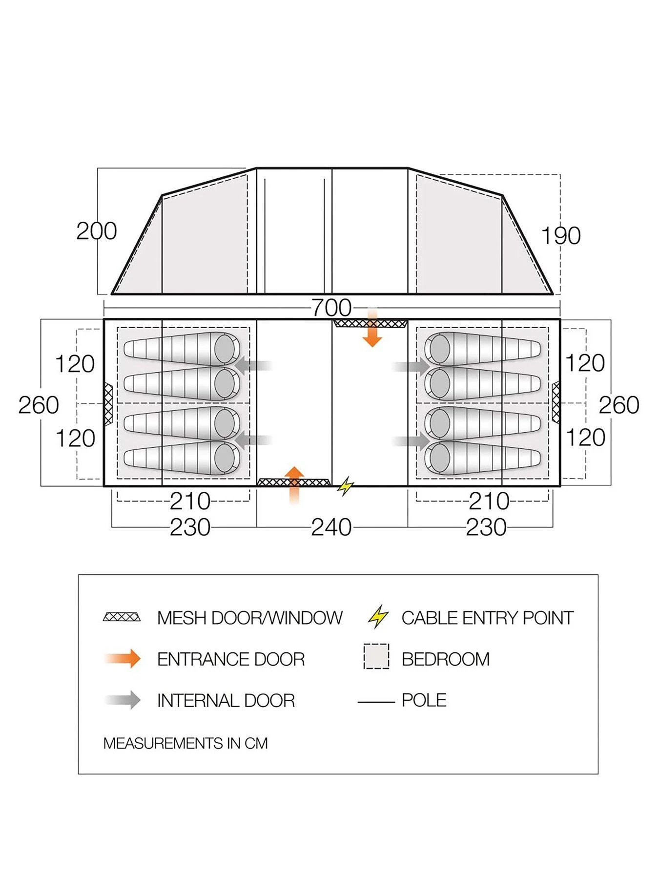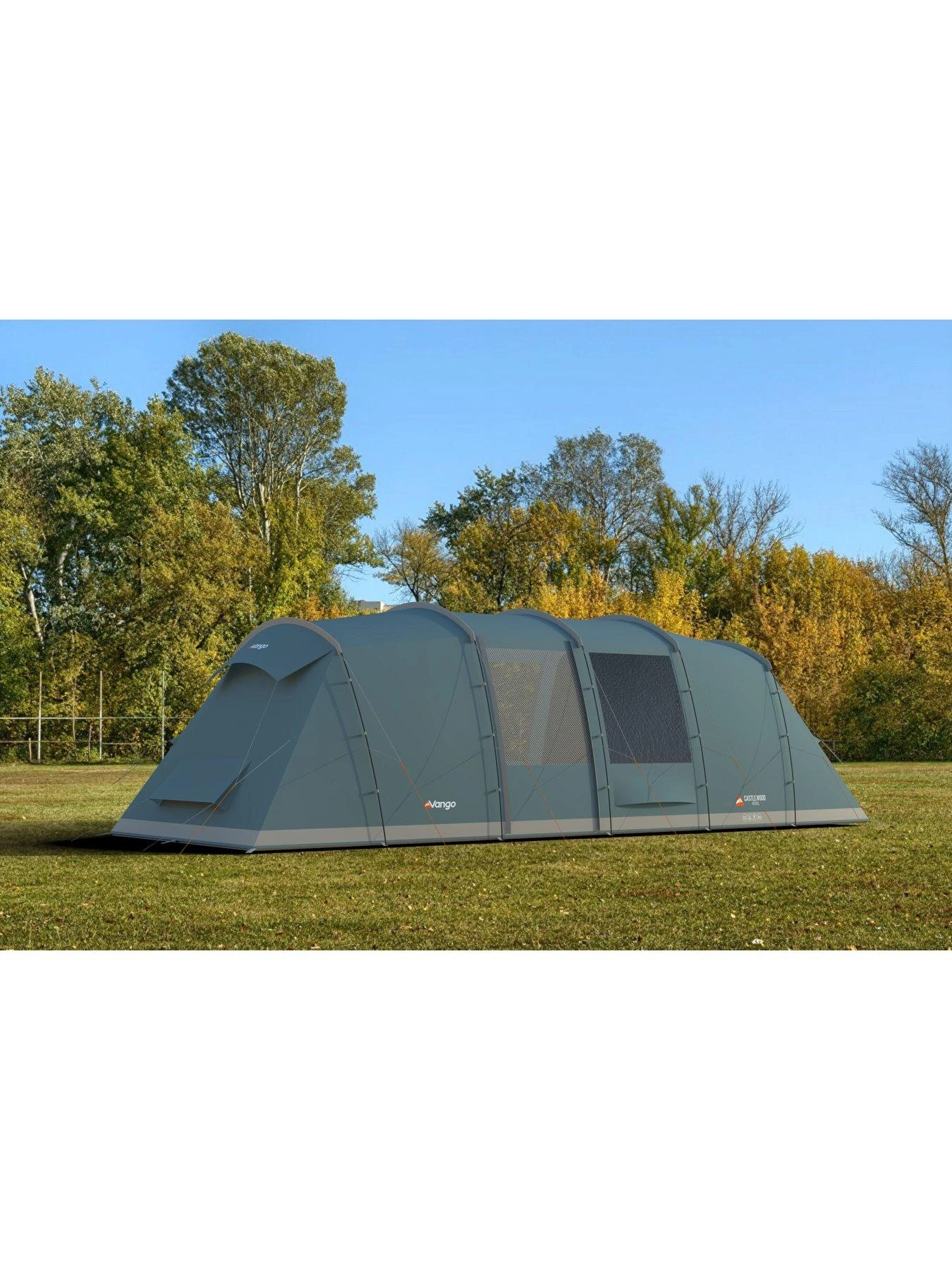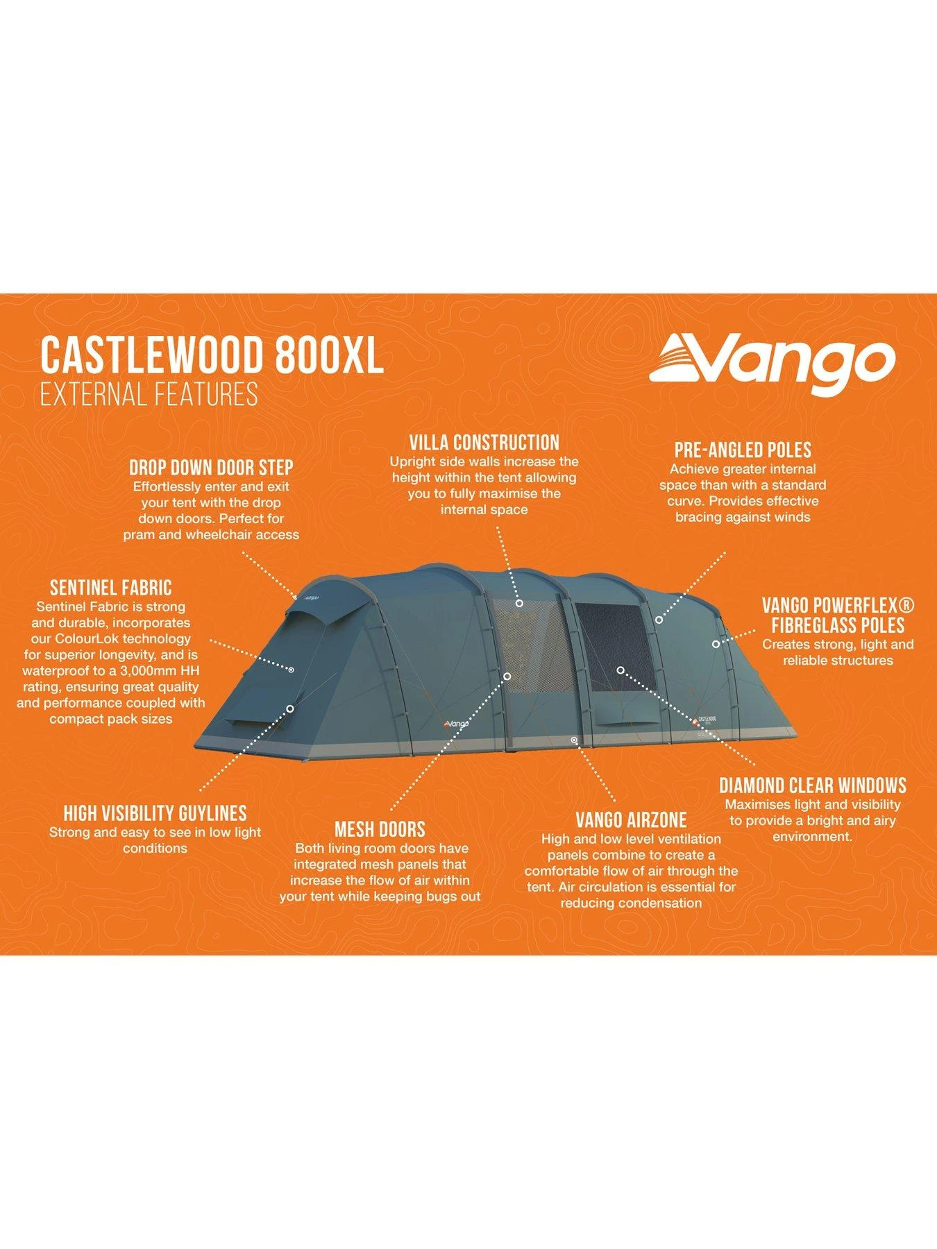 The Castlewood 800XL is an 8-man poled tent with a vis-a-vis layout. Airflow vents have been incorporated into the design to increase airflow and ventilation. The separate bedrooms each sleep up to 4 people. A groundsheet protector is included which will protect and extend the life of your groundsheet and tent. The Castlewood is designed specifically for campers who prefer more private sleeping areas, and is ideal for two families or couples to have separate sleeping areas with a generous living area in the middle. The living space incorporates large Diamond Clear windows allowing light to pour into the living area during the day with roll-away toggled curtains at night. The Sentinel Fabric keeps pack size and weight low. Sentinel Fabric is strong and durable, incorporates our ColourLok technology for superior longevity, and is waterproof to a 3,000mm HH rating, ensuring great quality and performance . Vango PowerFlex Fibreglass Poles – Creates strong, light and reliable structures. Pre-angled Poles achieve greater internal space than with a standard curve. Mirrored Bedroom Layout provides additional privacy, ideal for older kids or when sharing with friends, with bedroom spaces at either end of the tent. Extra large living area giving more space to relax and unwind or store your camping essentials. Queen Size Bedrooms provides a 60cm sleeping area per person meaning you have plenty of room to sleep and store essentials. Nightfall Bedrooms helps reduce early morning light so your sleeping pattern doesn’t need to be dictated by the sunrise. Fully Sewn-in Groundsheet adds to the comfort of your tent by providing a bug and draught free environment. Diamond Clear Windows maximise light and visibility to provide a bright and airy environment. High and low level ventilation panels combine to create a comfortable flow of air through the tent.