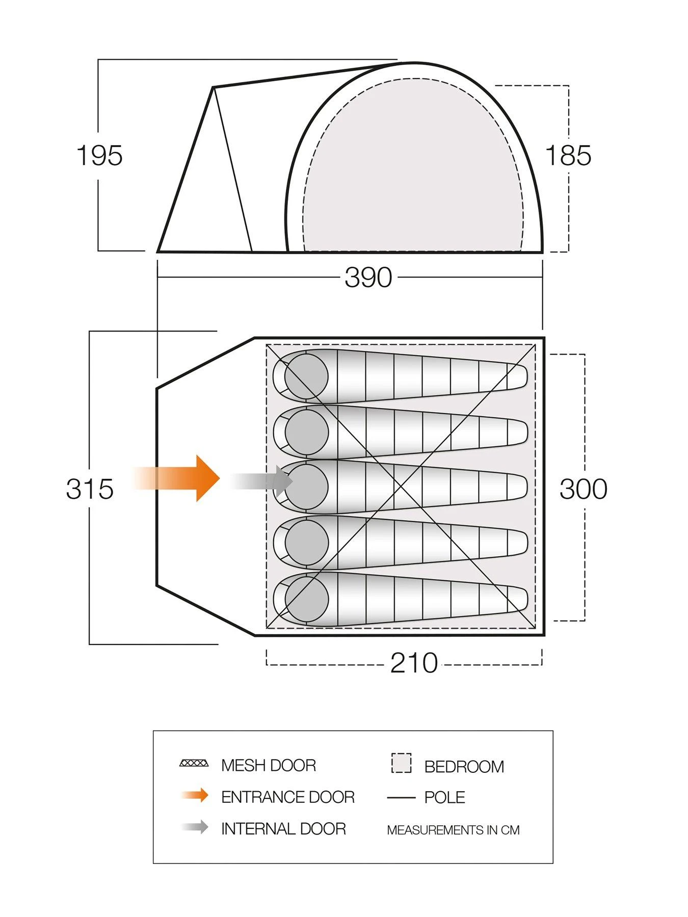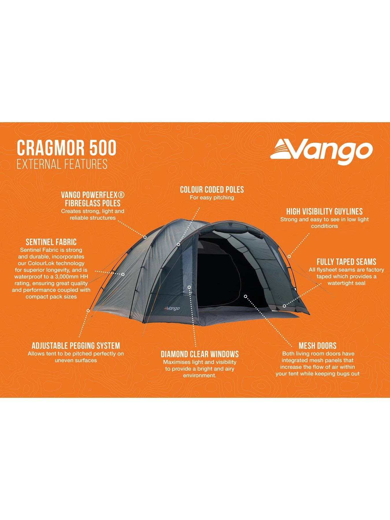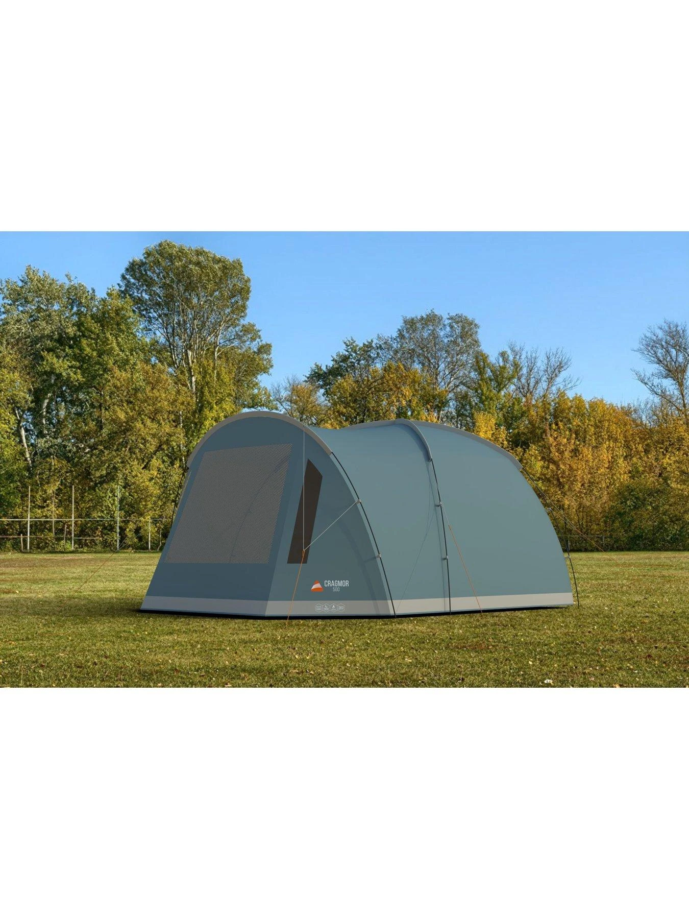 The Cragmor 500 is a 5-man, three-poled dome tent which features a large porch area with a linked-in groundsheet that is perfect for storing kit or sheltering from the elements. The Nightfall Bedroom allows for a better night’s sleep and the zipped, handled carry bag makes transportation to and from camp simple. The Cragmor is a versatile tent which is perfect for small families, couples and friends for weekend camps and festivals. Sentinel Fabric is strong and durable, incorporates our ColourLok technology for superior longevity, and is waterproof to a 3,000mm HH rating, ensuring great quality and performance . Vango PowerFlex Fibreglass Poles – Creates strong, light and reliable structures. Colour Coded Poles for easy pitching. Handled Carry Bag provides easy transportation to and from the campsite. Fire Retardant Fabrics meet European EN5912 safety standard. Queen Size Bedrooms provides a 60cm sleeping area per person meaning you have plenty of room to sleep and store essentials. Nightfall Bedrooms helps reduce early morning light so your sleeping pattern doesn’t need to be dictated by the sunrise. Linked-In Groundsheet is easy to clean and can be attached or detached from the living area. Simply roll under the bedroom area when not required. Diamond Clear Windows maximise light and visibility to provide a bright and airy environment. .