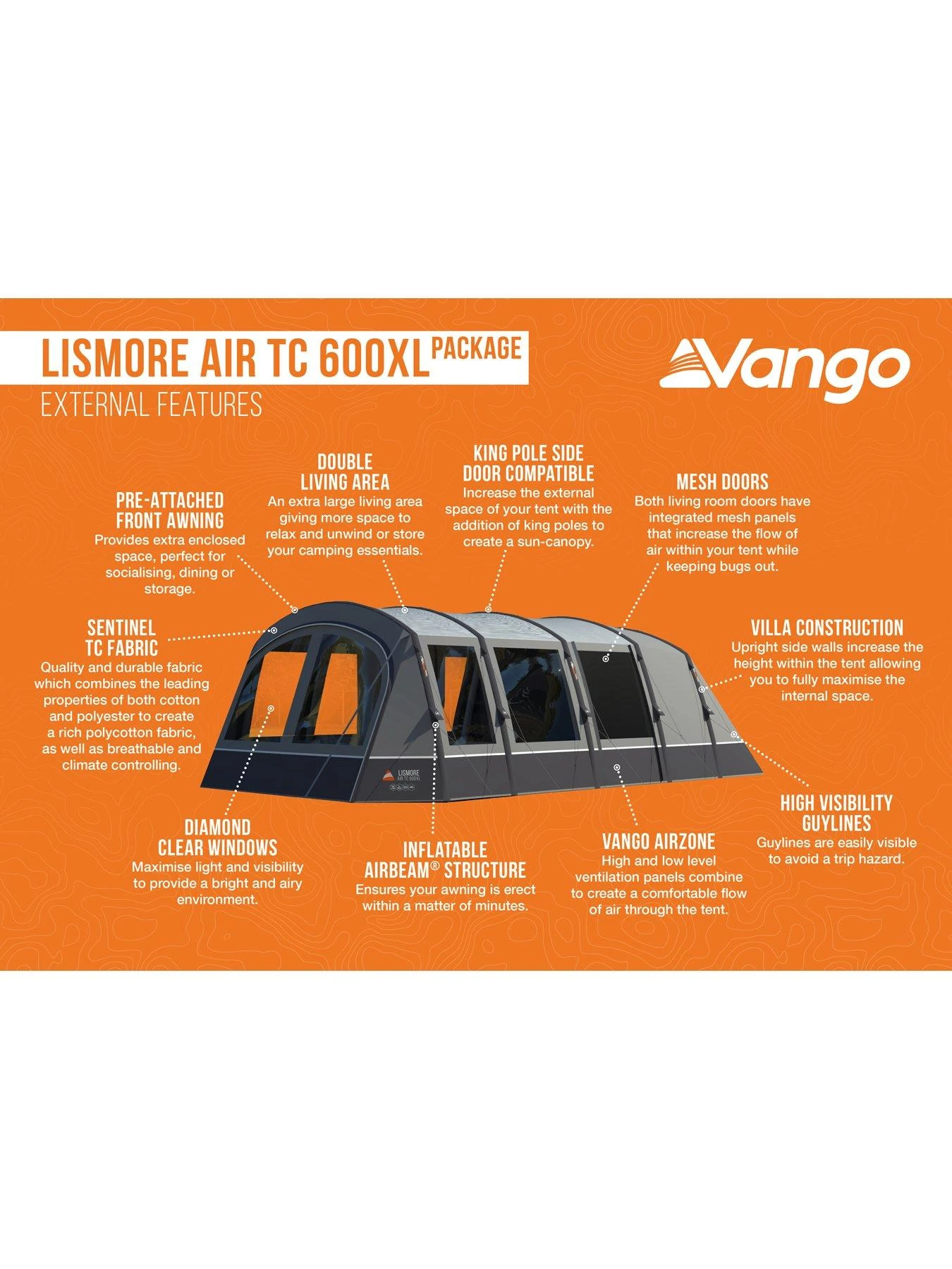 The Lismore benefits from Vango’s Sentinel TC Fabric which combines the leading properties of both cotton and polyester to create a rich polycotton fabric, that is breathable and climate controlling. This helps to keep the tent cooler when the weather is hot, and warmer in cold conditions..