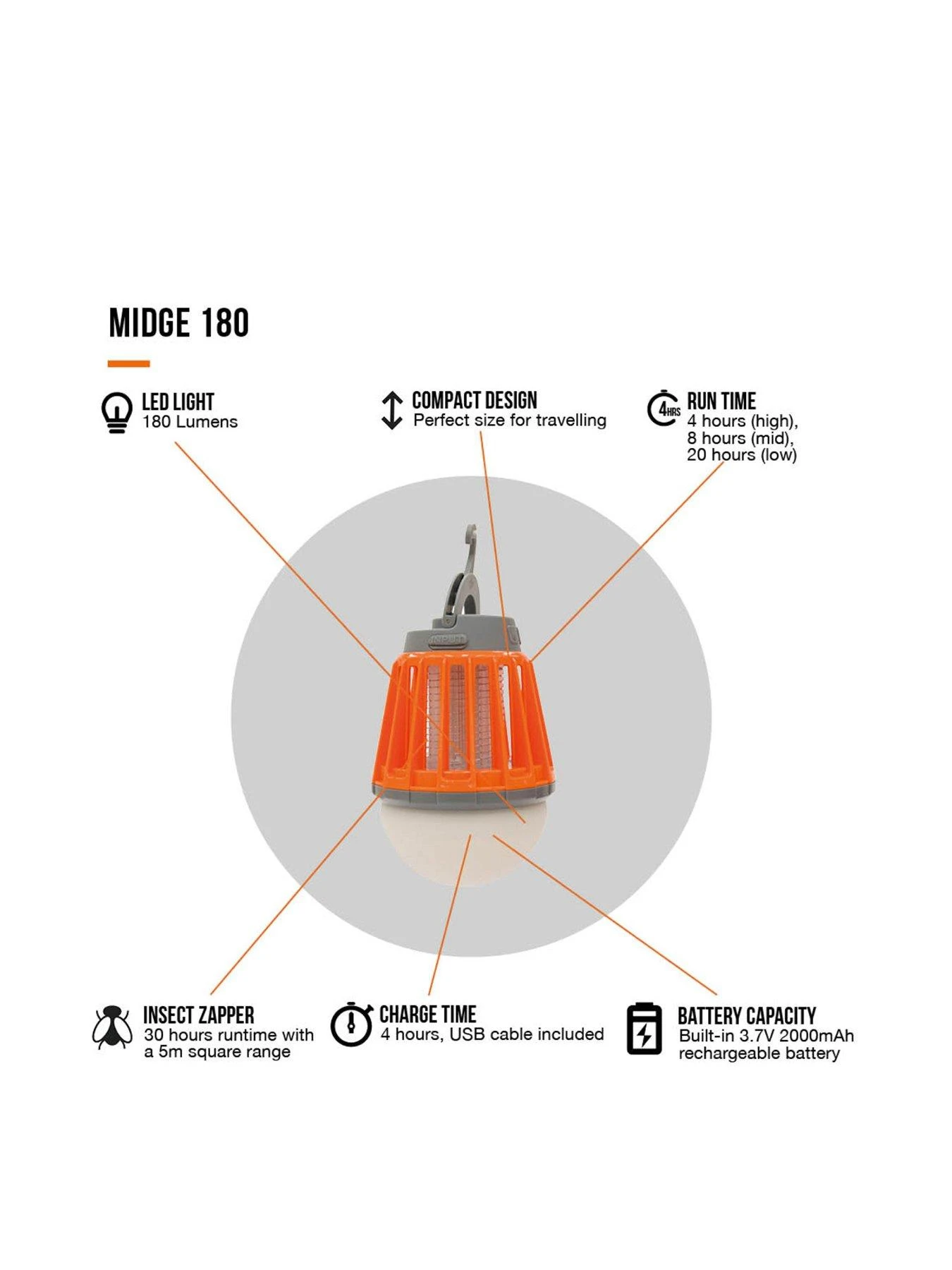 The Vango Midge 180 is a handy light, with the added benefit of controlling insects, using UV light to attract them. It also features a hanging hook for ease of use and flexibility and is easy to store due to its petite size. It has a 3 hour charge time and is resistant to water. Enjoy evenings in the outdoors without worrying about annoying insects.