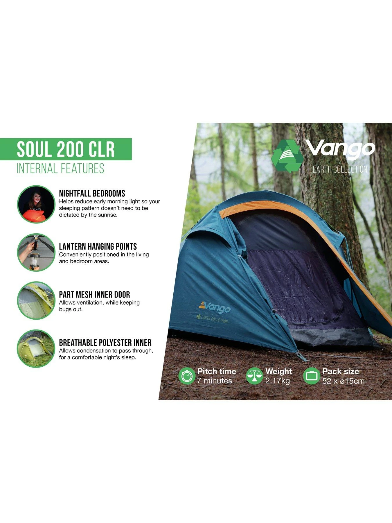 The Soul 200 CLR 2-man tent is the perfect festival tent. Benefiting with a Protex Zero Flysheet, the CLR range reduces waste by utilising offcut surplus trim fabric and 70D polyester made from single-use plastics. the Soul CLR is ideal for the environmentally conscious adventurer. Protex Zero Flysheet – Reducing waste by utilising offcut surplus trim fabric and 70D polyester made from single-use plastics.. Protex Zero is highly waterproof with a 3000mm HH, providing durability and reliability. Vango PowerFlex Fibreglass Poles – Create strong, light and reliable structures. Fire Retardant Fabrics – Exceeds European EN5912 safety standard. Wind and Rain Tested – Weather tested to standard EN ISO 5912 for peace of mind. Breathable Polyester Inner – Allows condensation to pass through, for a comfortable night’s sleep. Lantern Hanging Points – Conveniently positioned in the living and bedroom areas. High Visibility Guylines – Easy to see in low light conditions. Nightfall Bedrooms – Helps reduce early morning light so your sleeping pattern doesn’t need to be dictated by the sunrise. Fast Pack Tent Bag – Oversized opening for easy packing and compression straps to control pack size.