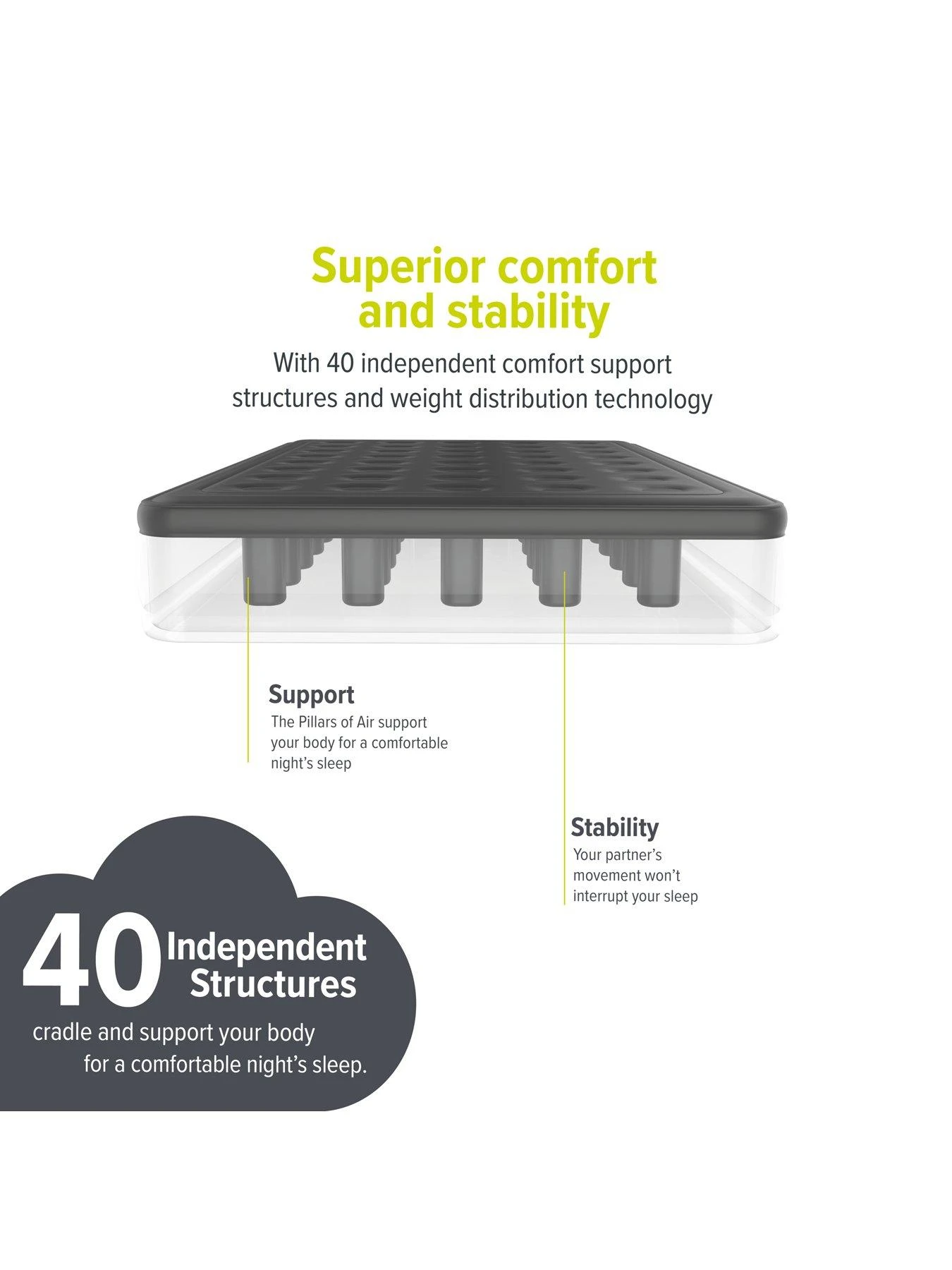 - 40* independent comfort support structures cradle and support your body throughout the night.